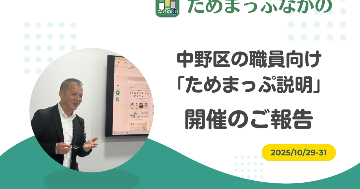 10月29日(水)〜30日(金)の3日間にわたり、中野区役所職員様向けに「ためまっぷなかの」操作説明会を行いました。 中野区様から公益活動についての説明、ためま株式会社 代表の清水から取り組みへの想いをお伝えし、実際に操 … 続きを読む 中野区職員向け「ためまっぷなかの」操作説明会を実施