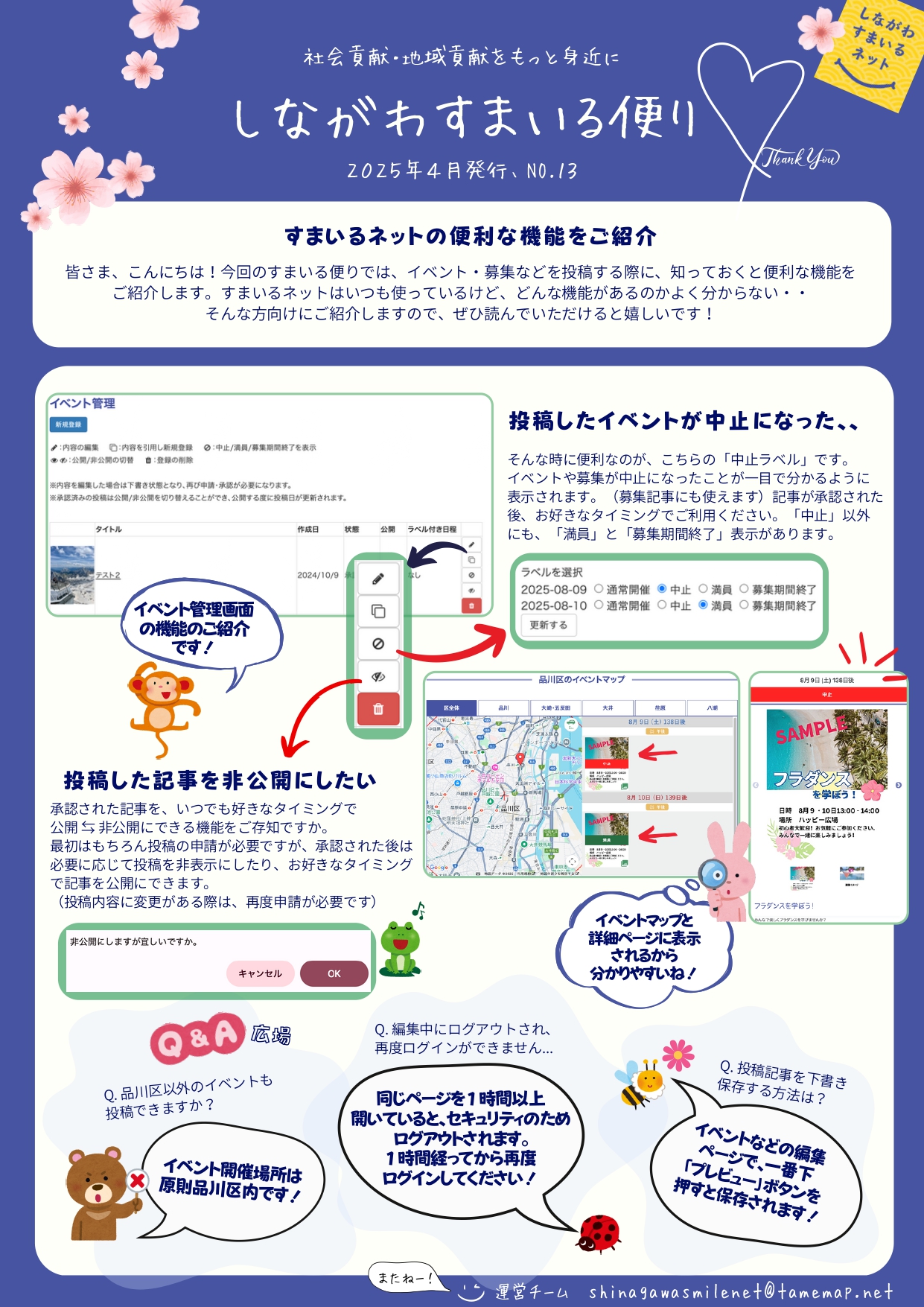 2025年4月に発行された最新号では、すまいるネットのイベント・募集などを投稿する際に、知っておくと便利な機能をご紹介します。